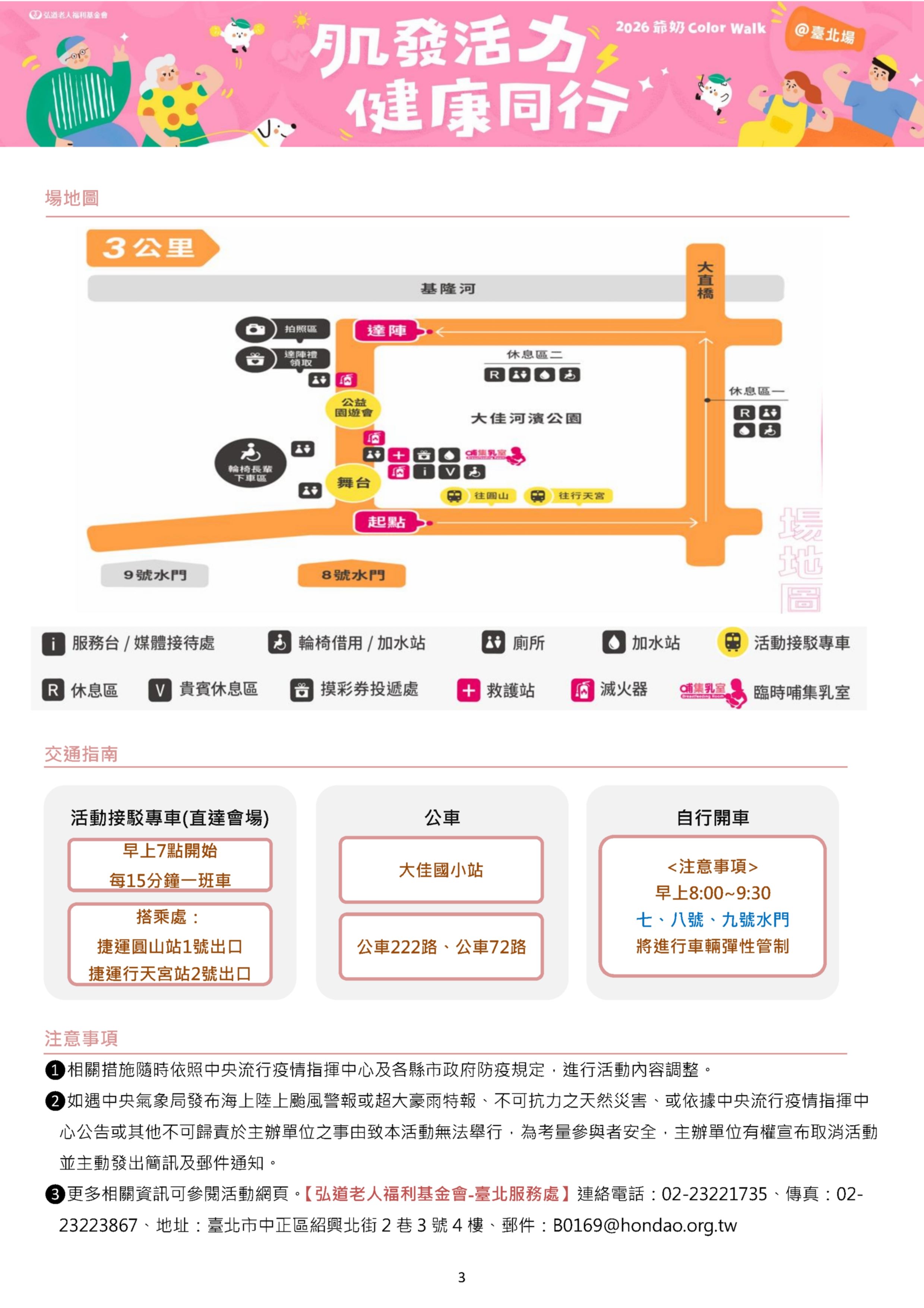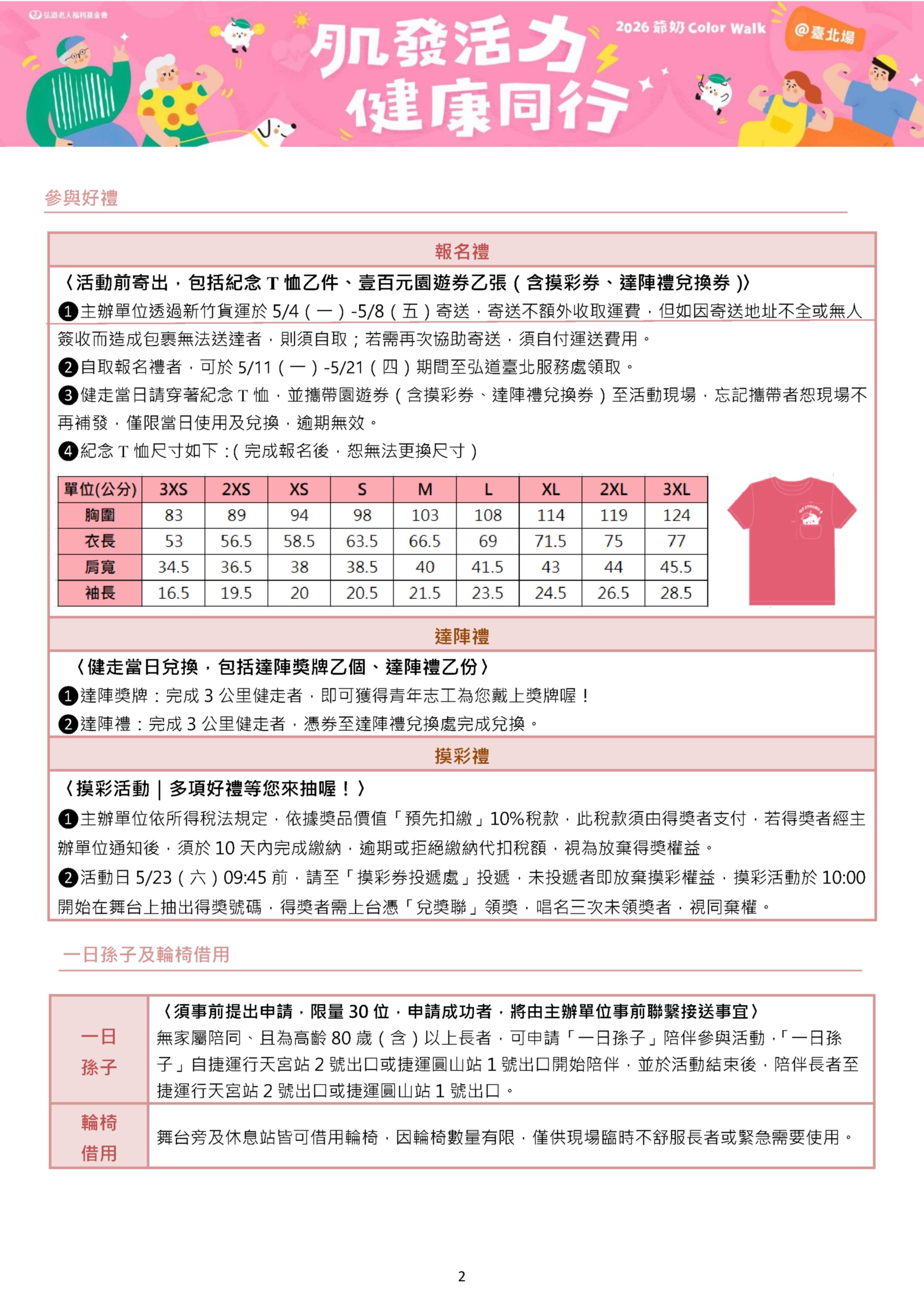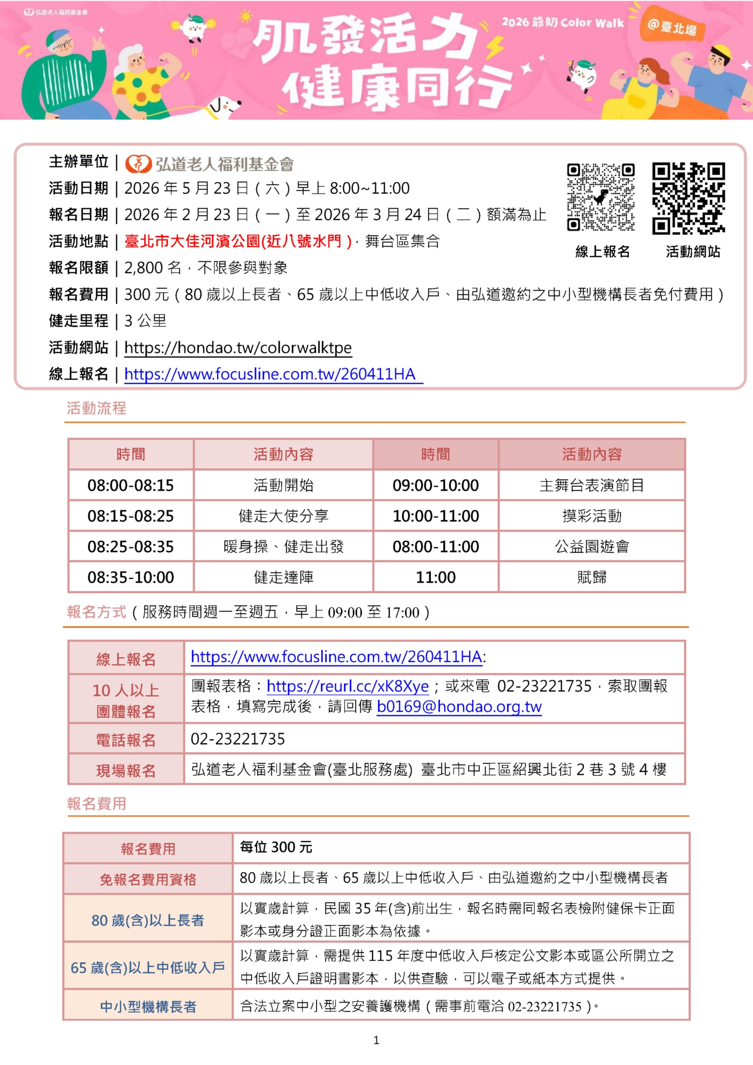 一、「2026爺奶Color Walk」創造專屬銀髮族的健走活動,邀 請長者走出家門、持續運動,落實預防照顧觀念。活動將於2026年5月23日(六)假臺北市大佳河濱公園辦理(近八號水門)。