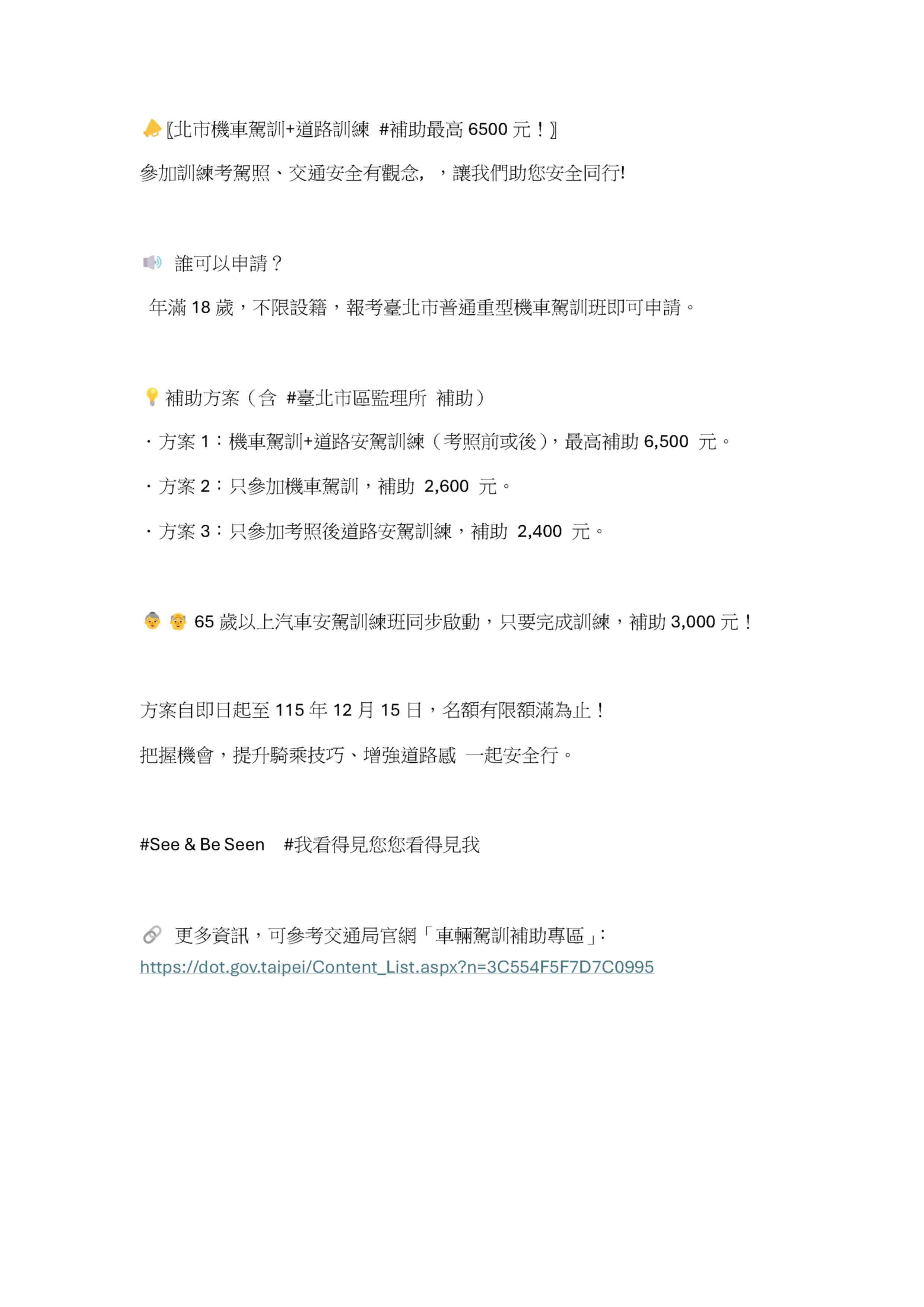 北市機車駕訓+道路訓練 #補助最高6500元!